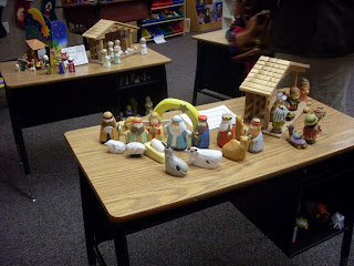 It is difficult to see in the above photos but even the cubbyhole's had nativity sets in them. I really liked the colors in the table below. There were a lot of Precious Moments nativity sets in this room.